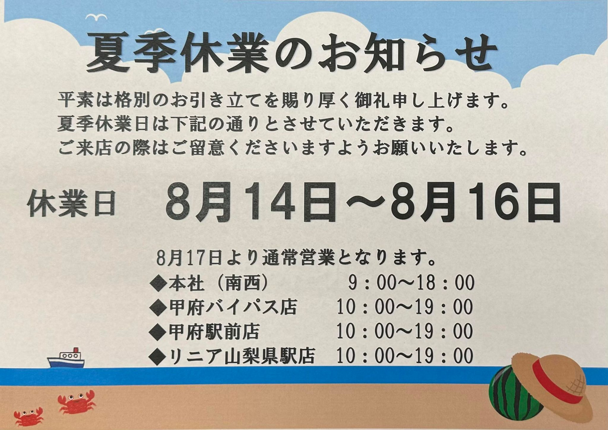 日頃は格別のご愛顧を賜り、誠にありがとうございます。下記の通り夏季休業とさせていただきます。